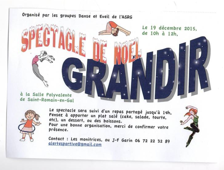 Les groupes d'Eveil et Danse de l'ASRG vous invitent à un spectacle à la Salle Polyvalente de St Romain en Gal.